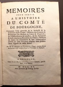 Dunod De Charnage (F. J.). Mémoires pour servir à l'histoire du Comté de Bourgogne, contenant l'idée générale de la noblesse & le nobiliaire dudit comté, l'histoire des comtes de Bourgogne [...]. Besançon, Jean-Baptiste Charmet, 1740 ; fort vol.