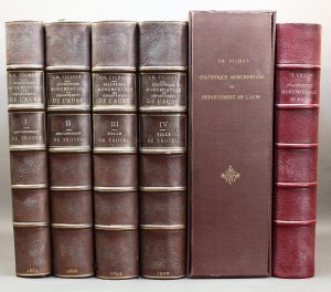 Fichot (Charles). Statistique monumentale de l'Aube. Paris, Chez l'auteur, Troyes, Lacroix, puis Ch. Gris, 1884-1900 ; 4 vol. in-8, demi-chagrin marron à coins, dos à nerfs, têtes dorées, [Rel. moderne] et 15 livraisons en un fort vol. in-8 sous
