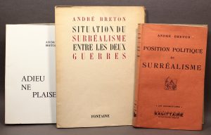 d'Auvergne numéroté et signé par Pab au crayon. Très bon exemplaire.— JOINTS, du même : • Position politique du surréalisme. Paris, Éditions du Sagittaire, 1935 ; in-12, broché, couverture saumon imprimée. Édition originale. Exemplaire sur papier d’édition. Petites pliures d'usage au dos, petite tache d’encre en pied de celui-ci ; intérieur frais. • Situation du surréalisme entre les deux guerres. Paris, Fontaine, 1945 ; in-8, broché, entièrement non coupé. Édition originale. Exemplaire sur papier d’édition. Couverture légèrement brunie, pli au premier plat