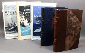 197 exemplaires numérotés sur papier vergé de Hollande (n° 159), avec la signature autographe de Paul Chack sur le faux-titre. De la bibliothèque Exbrayat (1962, n° 171).—joints, du même : • Branlebas de combat. Paris, Les Éditions de France, 1932 ; in-8, broché, sous étui. Édition originale. L’un des 65 exemplaires numérotés sur papier vergé de Hollande, avec la signature autographe de Paul Chack à la justification. De la bibliothèque Exbrayat (1962, n° 172). • Ceux du blocus. Paris, Les Éditions de France, 1928 ; in-8, broché, sous étui. Édition originale. L’un des 330 exemplaires numérotés sur papier vélin pur fil de Lafuma, avec la signature autographe de l’auteur à la justification. • L’homme d’Ouessant (Du Chaffault). Paris, Redier, 1931 ; in-8, broché, non coupé, sous étui. Édition originale. L’un des 100 exemplaires numérotés sur papier vergé de Hollande. • Sur les bancs de Flandre. Paris, Les Éditions de France, 1928 ; in-8, broché, sous étui. Édition originale. L’un des 165 exemplaires numérotés sur papier vélin pur fil de Lafuma, avec la signature autographe de l’auteur à la justification. Important ensemble de cinq ouvrages de Paul Chack