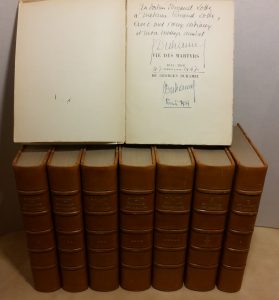 Helio supérieur. Tome 1 : Notaire du Havre.- Le jardin des bêtes sauvages. Tome 2 : Vue de la terre promise.- Nuit de la St Jean. Tome 3 : Le désert de Bièvres.- Les maîtres. Tome 4 : Cécile parmi nous.- Le combat contre les ombres. Tome 5 : Suzanne et les jeunes hommes.- La passion de Joseph Pasquier.— Joints, du même : • Vie et aventures de Salavin. Paris, Mercure de France,1948 ; 2 vol., même format, même reliure. L’un des exemplaires numérotés sur papier vélin. • Les Vies des martyrs. 1914-1916. Paris, Mornay, 1919 ; pet. in-8 carré, broché, couverture rempliée. Portrait de Georges Duhamel et figures dans le texte gravés sur bois par Jean Lébédeff. L’un des 949 exemplaires numérotés sur apier vélin de Rives. Celui-ci est enrichi de la signature autographe de Duhamel, datée de 1929 et d’un envoi autographe signé au docteur Fernand Lotte, daté du 21 janvier 1947. Le docteur Fernand Lotte est notamment l’auteur du Dictionnaire biographique des personnages fictifs de "La comédie humaine"