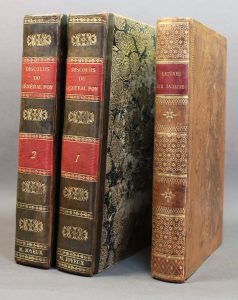 demi-basane bronze, dos long orné de motifs dorés, pièces de titre et de tomaison rouges, tranches marbrées, [Rel. de l’époque], plats légèrement frottés. Portrait en frontispice et d’un fac-similé. Seconde édition, parue l’année de l’originale. Ex-libris manuscrit Joyeux sur le premier f. faux-titre et celui de titre. Intérieur frais.— Joint : • [Dupaty (J. B.)]. Lettres sur l’Italie en 1785. Troisieme édition, augmentée d’une lettre. Paris, Desenne, 1796 ; in-8, veau raciné, encadrement d’une grecque dorée sur les plats, dos long orné, pièce de titre rouge, [Rel. de l’époque]. Mouillure affectant les premiers ff., sinon bel exemplaire. Barbier Ii, 1293