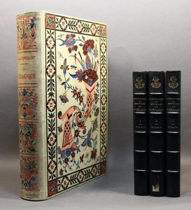 bleu nuit, dos à nerfs, monogramme Ab doré en tête des dos, [Rel. de l’époque]. Respectivement troisième, deuxième et deuxième éditions. Première partie, Orient : 55 vignettes sur bois par H. Catenaggi ; deuxième partie, Occident, Antiquité, Moyen Âge et Renaissance : 221 vignettes sur bois par J. Jacquemart ; troisième partie, Occident (Temps modernes) : 49 vignettes sur bois et 833 monogrammes par J. Jacquemart. Bel ensemble.— Joint, du même : • Histoire de la céramique. Étude descriptive et raisonnée des poteries de tous les temps et de tous les peuples. Paris, Hachette et Cie, 1873 ; in-4, cartonnage de l’éditeur, parchemin, large décor polychrome sur les plats et le dos, tête dorée, [Engel Rel., A. Souze]. Ouvrage orné de 12 belles figures hors texte gravées sur cuivre sous serpentes, 200 figures dans le texte gravées sur bois et 1000 monogrammes. Quelques rares et légères rousseurs ; cartonnage très légèrement frotté, sinon plaisant exemplaire