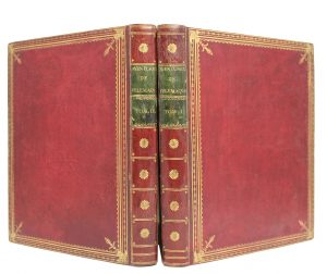 Debure daté 1773, 72 figures hors texte par Monnet gravées par Tilliard et 24 planches avec sommaire de chacun des livres - Reliure de l'époque maroquin bordeaux (signée Delorme) - Plats encadrés d'un quadruple filet doré et fleurons dorés dans les coins -Dos lisses ornés (de menus frottements) - Pièces de titre maroquin vert - A l'intérieur des 1ers plats figure le nom de l'ancien propriétaire en lettres dorées (Mr. de Saucourt) - Large dentelle dorée à l'intérieur des plats - Gardes moirées bleues - Tranches dorées - Petites fentes superficielles à la charnière du 1er plat du tome I - De pâles rousseurs éparses - Bel exemplaire à grandes marges. Brunet, II, 1215.