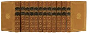 Théâtre - Didot l'Aîné, 1 790 (2 volumes) - Gonzalve de Cordoue - Didot l'Aîné, 1 791 (2 volumes) - Fables - Didot l'Aîné, 1 792 - Nouvelles nouvelles - Didot l'Aîné, 1792 - Don Quichotte (trad. par Florian) - Paris ; Chez Deterville, 1799 (3 volumes) - Guillaume Tell ou la Suisse libre - De l'Imprimerie de Guillemet, an X (1801) - [Relié à la suite :] Eliezer et Nephtaly - [De l'Imprimerie de Guillemet, an X (1801) ] - Soit 14 tomes en 12 volumes In-8° - 3 portraits, 3 frontispices et 67 figures gravés hors texte d'après les meilleurs illustrateurs de Florian - Reliure maroquin jaune citron (signée St-James, London au tome I du Don Quichotte) - Large dentelle et encadrement doré aux plats - Dos à nerfs ornés, titrés et datés or - Pièces de titre et de tomaison maroquin noir - Dentelles dorées à l'intérieur des plats - Bel exemplaire sur vélin tomé et relié début du XIXème siècle pour le célèbre bibliophile anglais Lord Vernon dont il porte les armes dorées au centre des plats - Tranches dorées - Galatée daté 1798 et Guillaume Tell daté 1789 aux dos par erreur - Petit accroc au dos du tome I de Théâtre, quelques rares griffures superficielles, mors du 1er plat de Nouvelles légèrement frotté, 1 petit accroc au 1er plat à ce même volume - Très bel état général cependant, très bel intérieur. Brunet, II, 1306.