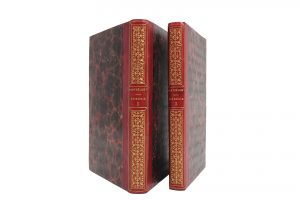 l'époque demi-veau glacé cerise - Dos lisse ornés d'entrelacs dorés et titrés et tomés or -Tranches marbrées - Bel exemplaire sur vélin. Carteret, III, 63.