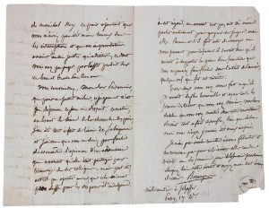 mon cher Carrel, vous féliciter du succès de votre plaidoyer, succès dans le public, j'entends. Mais je crains de ne pouvoir de la semaine vous aller rendre une petite visite. Si je vous donnais mon avis, vous pourriez le suspecter de partialité. Je vais vous rapporter ce que me disait hier un pair, juste milieu, qui voulait la condamnation du National, mais la peine la plus minime. Selon lui et ceux de son banc, votre discours était empreint de dignité, de mesure et dégagé des fanfreluches à effet, trop souvent prodiguées par l'esprit, vous leur avez préféré le ton sûr et la logique, et par le ton général du discours, vous pouviez arriver sans effort à votre grande et grave récrimination, à la mort du Maréchal Ney. Ce pair ajoutait que vous n'aviez pas été moins heureux dans les interruptions et que vos improvisations avaient été aussi justes qu'adroites, ce dont vous sûtes préjuger par l'effet produit dans ce bon et brave [?]. Vous conviendrez, mon cher Prisonnier, que pour un juste milieu, ce jugement n'est pas dépourvu de sens ni d'esprit. Ce matin, en lisant la séance de la chambre des pairs, j'ai été tout à fait de l'avis de [Joseypreurin ?] et j'ai cru que vous ne seriez pas fâché de connaître l'opinion d'un adversaire qui [?] qu'elle était partagée par beaucoup de ses collègues. Mais peut-être eut-il pu ajouter encore que cela n'avait pas suffi pour les cris pour l'indulgence. A cet égard, un avocat eut pu, eut dû même parler autrement pour gagner ses juges aussi M. [Rouens ?] a-t-il fait acte de courage en vous prenant pour défenseur : il savait bien qu'il aurait à supporter la peine d'une franchise que vous ne pouviez faire fléchir dans l'intérêt de l'accusé quelque vif que fut cet intérêt. Tous deux vous avez [?] fait ce qu'il y avait de plus honorable et après toutes les preuves de talent que vous avez montré dans cette circonstance, devient tout à fait superflu, bien que selon moi vous n'ayez jamais été mieux inspiré. Je n'ai pas voulu remettre à vous féliciter et ne renonce pas pour celui d'aller vous rendre visite un des premiers jours de la semaine prochaine. Soignez bien votre santé et croyez-moi tout à vous devant. Béranger. Mille amitiés à [Jezaffer ?] - Passy, 17 oc. [1834]» - Ecriture bien lisible à l'encre noire - Marques postales - Coin inférieur du second feuillet déchiré avec petite perte de papier sans affecter le texte - Bon état.