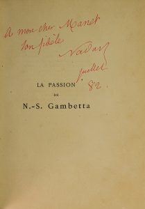 [Caricature] - Nadar - La passion illustrée sinon illustre de N.-S. Gambetta^ - Paris ; 1882 - 1 volume In-12° - Titre en rouge et noir, illustrations en noir in texte - Reliure demi-chagrin cerise - Dos à nerfs titré or et orné de filets -...