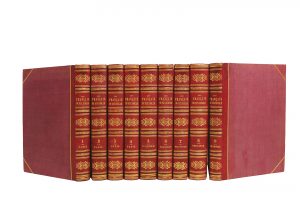 intégrante de cet ouvrage forme le 9ème volume - Le tome V est titré «Armée» au dos - Complet de ses 415 planches hors texte coloriées et gommées à l'époque dont 8 frontispices auxquelles on ajoute 1 carte en 3 tons sur double page, le tout sous serpentes de papier jaune, de très nombreuses vignettes en noir hors texte, bandeaux et culs-de-lampe historiés d'après Bellangé, Charlet, Daubigny, Daumier, Gavarni, Grandville, Vernet, Johannot, etc. - Premier tirage de cette amusante galerie de portraits et de vieux métiers signée par les plus belles et célèbres plumes de l'époque : Balzac, Gautier, Nerval, Borel, Janin, Monnier, Sand, etc. - Agréable reliure de l'époque demi-chagrin cerise (signée Weidle) - Dos à nerfs ornés de motifs et de filets dorés, titrés et tomés or (de très légers et rares frottements, mors du tome III fendu au 2nd plat sur 2,50 cm) - Ex-libris d'époque (non identifié) répété à chaque intérieur de 1er plat - Collation (erronée) à l'encre noire de l'époque à l'intérieur des 1ers plats des tomes I et IX -Très bel exemplaire. Carteret, III, 245.