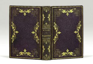Paris, Bourgueleret, 1838. In-8, chagrin prune, triple filet doré, listel dessiné par deux filets enchevêtré aux angles et interrompu au milieu de chaque côté par de gros rinceaux, dos lisse orné de même, large roulette intérieure, tranches dorées (Simier R. du Roi). Édition originale de la traduction de Charles Nodier. Un frontispice avec le portrait de l’auteur gravé sur bois, tiré sur chine collé, 10 figures hors texte de Tony Johannot gravées sur acier, protégées par une feuille de papier de soie portant la légende imprimée, et environ 100 vignettes gravées sur bois dans le texte par Best, Leloir, Lacoste, etc. Premier tirage. Bel exemplaire, non cartonné, bien complet de ses papiers de soie avec légendes imprimées. Jolie et fraîche reliure d’Alphonse Simier. De la bibliothèque Henri Beraldi (III, 1934, n°182), avec son ex-libris. Petit éclat à la coiffe de tête.