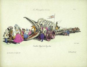 Extraordinaire album, complet des 73 superbes planches de Grandville lithographiées par Langlumé, en premier tirage. EXEMPLAIRE EN COLORIS DE LÉPOQUE, possédant le premier plat de la couverture, le très rare titre portant l’adresse de Bulla et la date 1828, ainsi que le rare feuillet contenant la notice d’Achille Comte. Il est enrichi d’UN DESSIN ORIGINAL ÀLAQUARELLE DE GRANDVILLE (environ 130 x 70 mm), représentant l’un des personnages principaux de la planche 52, ainsi que de 17 épreuves : - 7 épreuves en noir des planches 4, 5, 31, 44, 51, 68 et 71. - une rare épreuve en couleurs de la planche 34 à l’adresse London 1st January 1829, Published by Mc Lean 26 Hay Market (cf. Vicaire, V, col. 780). - 3 épreuves d’essai de coloris de la planche 72, intitulée Une bête féroce ou un ami de la Gazette. - 2 épreuves d’essai de coloris de la planche 73, intitulée Famille de Scarabées, dont l’une avec indications notées au crayon. - 2 planches non numérotées, en noir et coloriée, intitulées La Chasse et la Pêche. - une planche coloriée non numérotée intitulée Chien d’arrêt ! Emmenant un réfactaire [sic] Vendéen. - une planche coloriée non numérotée intitulée La Baleine d’Ostende, Visitée par l’Éléphant, la Giraffe, les Osages et les Chinois. Petites rousseurs à la planche 27, feuillet de la notice d’Achille Comte réemmargé. Charnières marquées.