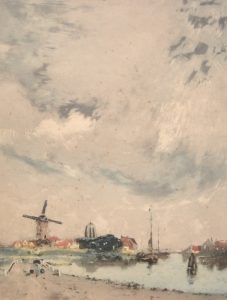 CASSIERS (Henri). "Paysage au moulin" (1925). Eau-forte et aquatinte en couleurs, just. 181/350, signée au crayon et montée sous passe-partout de toile grège et cadre en bois (abîmé). P., L'Estampe moderne, 1925, dim. cadre : 56 x 46 cm ; sujet...