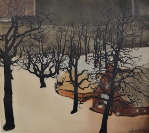 DE SAEDELEER (Valerius). "Verger sous la neige". Eau-forte et aquatinte en couleurs tirée par Armand Apol, titrée, just. 144/250 et signée au crayon par le graveur. Planche d'interprétation montée sous cadre noir et doré en bois (abîmé). Dim....