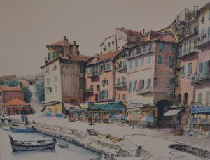 FREDERIC (Georges). "Villefranche" (1958). Encre et crayons de couleurs sur papier, datée, signée au coin infér. droit et montée sous passe-partout et cadre doré en bois. Dim. cadre : 54 x 64 cm ; sujet : 35 x 45 cm.
