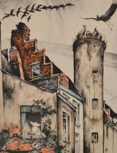 LANGASKENS (Maurice). "La Fuite des heures". Eau-forte originale en couleurs tirée sur Japon nacré, titrée, just. 54/150 et signée au crayon. Dim. support : 57 x 40 cm ; sujet : 35 x 27 cm.