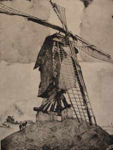 LANGASKENS (Maurice). "Le Géant" [Moulin]. Eau-forte en noir tirée sur Japon nacré, titrée, just. 41/100 et signée au crayon. Dim. support : 66 x 50 cm ; sujet : 46,5 x 35 cm.