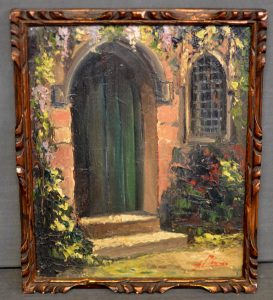 LIÉNAUX (Fernand). Sans titre [Entrée luxuriante]. Huile sur panneau, signée au coin infér. droit et montée sous cadre en bois. Dim. cadre : 26 x 21,5 cm ; sujet : 24,5 x 19,5 cm.