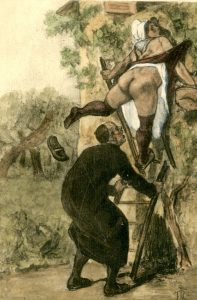 ROPS (Félicien). "La Vigne du curé". Héliogravure en couleurs, montée sous passe-partout et cadre en bois. Dim. cadre : 33 x 27 cm ; sujet : 14,9 x 10 cm (Exsteens, 1127).