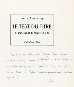 ALECHINSKY (Pierre). Le Test du titre. 6 planches et 61 titreurs d'élite. P., Yves Rivière, 1974, 4°, ill. in-texte en noir, br., couv. marbrée rehaussée d'une double pièce de titre. Envoi sur la p. de titre de Louis Scutenaire : "Hé bien,...