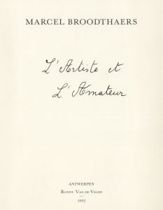 BROODTHAERS.- Marcel Broodthaers. Divers documents en facsimilé réalisés à l'occasion de l'exposition Marcel Broodthaers chez Ronny van de Velde (Anvers, 1992) : "L'Artiste et l'Amateur" (facsimilé d'un cahier de 1963 + 1 vol. avec la...