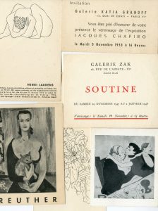 Cartons d'invitation.- Ensemble d'une trentaine de pièces comprenant des expositions personnelles de Gromaire (Galerie Louis Carré, 1950), Soutine (Galerie Zak, 1947-48), Bissière (Galerie Jeanne Bucher, 1952), Henri Laurens (Galerie der Spiegel,...