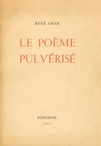 CHAR (René). Le Poème pulvérisé. P., Fontaine, 1947, petit 4°, br. (couv. lég. passée). Edit. orig. tirée à 1265 ex. num. 1/1200 sur simili-Japon (ex. n° 1).