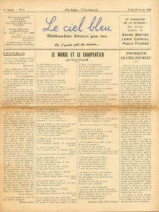 "Le Ciel bleu". Hebdomadaire littéraire pour tous. Brux., du 22 février au 19 avril 1945, 9 fasc. de 37,5 x 27,5 cm, de 4 p. chacun (brunissure à 2 fasc., petites déchirures marginales). Hebdomaire dont la rédaction était assumée par Paul...