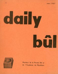 DAILY-BUL.- Moniteur de la Pensée Bûl et de l'Académie de Montbliart. N° 1-5. Comité de rédaction : André Balthazar et Pol Bury. La Louvière, Editions de Montbliart, mars 1957 et suivantes, 5 fasc. 8°, agrafé. Collaboration de Pol Bury,...