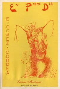 DONATI.- GOMEZ-CORREA (Enrique). En pleno dia. Portada e ilustraciones de Enrico Donati (couverture, titre et 9 compositions). Santiago de Chile, Mandragora, 1949, 4°, 51 p., br. (dos bruni et piqué, forte trace d'humidité dans la partie infér.,...