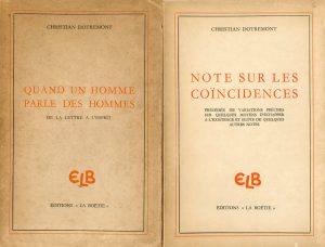 8°, 64 p., br. (couv. lég. brunie). Edit. orig. (pas de grand papier)./ IDEM. Quand un homme parle des hommes. De la lettre à l'esprit. Brux., "La Boétie", s.d., gd 8°, 74 p., br. (couv. fort brunie). Edit. orig. (pas de grand papier)./ IDEM. La Mathématique du ténu. L'Homme à naître. Brux., "La Boétie", 1946, gd 8°, 96 p., br. (couv. brunie). Edit. orig. (pas de grand papier)./ Ens. 3 vol.