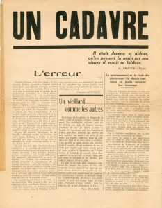 FRANCE (Anatole). "Un cadavre". Neuilly-sur-Seine, Impr. spéciale "du Cadavre", s.d. (18 oct. 1924), 1 f. 4° de 4 p. imprimées en noir (pli central renforcé au papier collant, déchirures au niveau des plis). Premier texte surréaliste collectif...