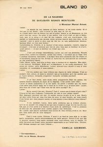 GOEMANS (Camille). "Correspondance". Blanc 20. Brux., 226 rue de Mérode (Impr. J. De Weirt), 30 mai 1925, 1 f. de 31 x 20,5 cm, imprimé au recto (papier lég. froissé, bord droit bruni). Critique de Camille Goemans sur les livres "Terres...