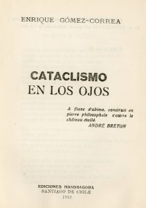 GOMEZ-CORREA (Enrique). Cataclismo en los ojos. Santiago de Chile, Mandragora, 1942, 8°, 42 p., br., couv. rempliée (couv. frottée, piqûres en tête et fin de vol.). Edit. orig. Second recueil de poésie du plus grand poète chilien surréaliste....