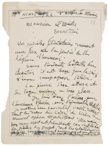 11 mars 1924. « Vos cordiales félicitations donnent une force à la pensée de la Légion d’honneur. Dans l’ardente bataille du chantier il est bon que la voix d’un compagnon s’élève. La pierre s’en assure et se loge mieux à son plan. Je suis dans l’océan, pour l’ancienne Phocée, pour l’admirable Massilia. Je construis un bas-relief, vaste, divers tout le dessus du cadre de scène du nouvel opéra marseillais. Ma main par mon esprit est frémissante car c’est là-bas la patrie du Puget, dont les splendides galères royales rêvent puissamment au fond des flots »... 3 décembre 1924. Lettre à laquelle fut épinglé un « dessin fait après lecture de votre beau livre Judith » : « Je suis honoré par l’envoi de vos œuvres puissantes. Touché par les dédicaces qui les désignent en faveur de mon Art. Permettez-moi de joindre à mes sentiments mon admiration pour votre grand Art »...