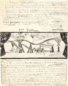 Équilibres. Ensemble de 7 pages de textes et de dessins à l’encre de Chine et lavis, notes sur l’équilibre et le déséquilibre : « Le déséquilibre sensuel donc variations sur l’équilibre et le Désiquilibre. Sens de la vie provenant de l’incertitude de ces deux états. Passages de l’un à l’autre [...] La forme du déséquilibre la plus propice au développement de l’esprit est celle où l’on s’éloigne de l’équilibre [...] Le Génie vient d’une forme de déséquilibre. C’est au moment où l’on sent l’objet en déséquilibre qu’on sent un état divin qui si on pouvait le réaliser vous ramènerait à l’équilibre »... Un « Ier Tableau » représente : « Sur la même scène deux états d’âme différents 2 foyers traversés par un immense escalier toboggan » : sont indiqués la Figure du Rêve, la Figure de la Réalité, et le sens d’autres objets : escalier, boules noires, pendules... Au dos, un « 2ème Tableau » représente le toboggan et « 3 pochars » aux « physionomies plutôt tragiques », ainsi que trois cyclistes. Suivent un commentaire sur ce tableau, et des croquis d’une femme nue allongée, et de deux personnages de fantaisie sur échasses ; au dos, d’autres versions de la femme nue... En pleine page, quatre personnages en maillot illustrent des « équilibres » (« cheveux taillés en brosse 3 types d’hommes bien semblables autant que possible »)... Un autre ensemble de 4 pages de texte illustré sous le titre : Fleurs naturelles fleurs artificielles (paysage, femmes-fleurs, etc.). Plus des dessins d’acrobates, et d’une femme aux seins nus, montée sur échasses, tenant une ombrelle. On joint une planche extraite de la Gazette du Bon Ton, juin 1914.