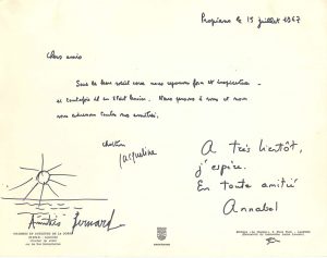 Carte écrite à quatre mains avec son épouse Annabel et un couple d’amis (Christian et Jacqueline) qui partage leurs vacances en Corse. Dans le coin inférieur gauche, Bernard Buffet a fait un dessin au feutre noir figurant un soleil resplendissant au-dessus de la mer, et signé : « Amitiés, Bernard ».