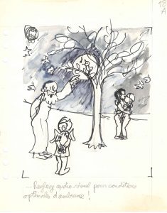 Dessin au feutre noir et lavis pour un album sur La Vie amoureuse d’Adam et Ève (le titre est inscrit au verso par Effel), les représentant s’embrassant sous un arbre dans lequel chante un oiseau, désigné par Dieu, avec cette légende : « Réglage audio-visuel pour conditions optimales d’ambiance ».