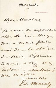« Je crains de ne pouvoir aller ce soir chez vous – mais faites-moi donc le plaisir de venir déjeuner demain à 1 h ½ chez Tortoni – Mallarmé sera des nôtres »... [Il faut citer l’évocation par Mallarmé, dans Divagations, de Manet, « railleur à Tortoni, élégant ».]