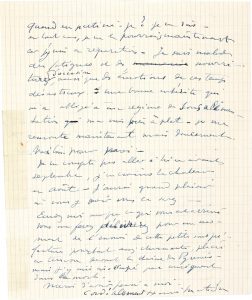 Nouvelles après l’exode et l’armistice (24 juin 1940). [Montherlant, en mai 1940, s’était engagé comme correspondant de guerre ; au front, il fut légèrement blessé par un petit éclat de bombe à l’aine, et quitta l’armée le 7 juin pour rejoindre le Midi.] « Enfin vous y avez été, et vous en êtes sorti – avec une égratignure ! Tout est donc pour le mieux. Votre lettre m’a fait plaisir car je me suis demandé ce que vous étiez devenu »... Quant à lui, « mon billet pour Rio était pris et mes papiers en règle », mais il a dû annuler son départ : il devait embarquer à Gênes le 6 juin, mais le 20 mai l’arrivée des Allemands à Laon, et « les Italiens rappelant leur nationaux de Suisse », le force à tout abandonner et à partir pour Bordeaux, mais après « 2 jours d’un séjour affreux, les gens couchant la nuit dans les rues », il a filé à Saint-Jean-de-Luz pour un mois : « Après l’armistice, avant l’arrivée des Allemands, j’ai pu le quitter pour regagner Nice. Mais je fus arrêté ici et bloqué faute de moyens de locomotion ». Il est bloqué à Saint-Gaudens, « malade des fatigues et des nourritures d’occasion, ainsi que des émotions de ces temps désastreux : une bonne entérite qui m’a obligé à un régime de sous-alimentation qui m’a mis bien à plat ». Il va mieux mais ne compte pas rejoindre Nice avant septembre, craignant la chaleur d’août : « j’aurai grand plaisir à vous y voir vous le savez. Écrivez-moi un peu ce qui vous est arrivé, vous me ferez délivrer pour un moment de l’ennui de cette petite sous-préfecture pourtant assez charmante, placée en terrasse devant la chaîne des Pyrénées »...