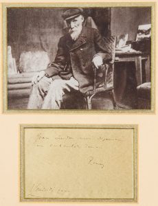 * Auguste RENOIR (1841-1919). L.A.S., Vendredi soir [27 novembre 1896], à Teodor de Wyzewa ; 1 page obl. in-12 (carte postale), adresse au verso (encadrée avec portrait photographique).