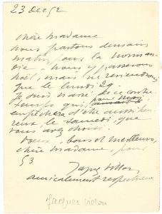 « Nous partons demain matin, pour la Normandie – nous y passerons Noël, mais ne reviendrons que le lundi 29. Je sui navré de ce contretemps qui, pour moi, empêchera d’être aussi heureux, le samedi, que vous avez choisi »...