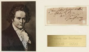 Ludwig van BEETHOVEN (1770-1827). P.A.S. (fin de lettre) ; 1 page oblong in-12 (5 x 12 cm ; encadrée avec portrait).
