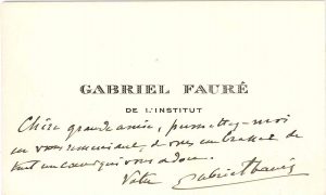 Gabriel FAURÉ (1845-1924). Carte de visite avec 3 lignes autographes signées, [à la comédienne Julia Bartet] ; petite carte obl. in-24 Gabriel Fauré de l’Institut.