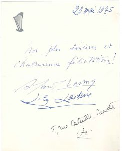 Mlle M. Blairval (2, professeur de piano de Gavoty), Gabriel Bouillon, Hélène de Charme (secrétaire de Reynaldo Hahn, 3), Jean Cotté, René Dumesnil (2), Clarita de Forceville (nièce de Reynaldo Hahn, 3), Monique de La Bruchollerie, Lily Laskine et Roland Charmy, Nela Arthur Rubinstein. On joint une lettre de condoléances de Marie Boutet de Monvel à Mme Gavoty.