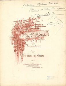 Partition imprimée (cot. H. et Cie 7777) de cette mélodie, avec dédicace autographe signée : « à Madame Alphonse Daudet. Hommage de respectueuse affection. Reynaldo Hahn Février 93. »