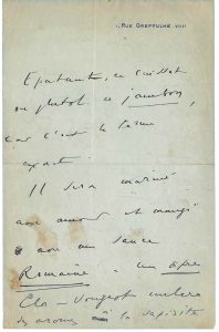 « Pourquoi ne pas essayer Martigny, puisque Gérardmer ne vous a pas convenu ? Après les cures, il est bon de faire une cure de repos et d’air pur ». Il la prie de lui donner des détails sur sa santé et la félicite pour un bon mot : « Votre “je la plains de tout mon nez” est un trait à la Sévigné : c’est charmant ». Sa mère va mieux depuis qu’on lui fait du galvanisme… – Remerciements pour l’envoi de victuailles : « Le pâté était admirable ainsi que les macarons ; le pâté a été dévoré en un déjeuner. Les macarons vont l’être aujourd’hui ». Il a entrepris son concierge sur Dreyfus : « je ne l’appelle plus que le Capitaine ». Il parle de restaurants, va emmener son frère manger des moules. « Mes Rondels paraissent dans quelques jours »… – Lettre gourmande, remerciant pour l’envoi de gibier : « Épatant, ce cuissot ou plutôt ce jambon car c’est le terme exact. Il sera mariné avec amour et mangé avec une sauce Romaine. Un âpre Clos-Vougeot mêlera ses aromes à la sapidité de la venaison ». Il regrette qu’elle ne soit pas venue mercredi : « Vous auriez mangé un très bon petit sauté d’agneau aux primeurs ». On jouera le 6 « non seulement le Quintette, mais aussi le Divertimento »… Versailles, mercredi. « Comme je ne vais presque jamais au Ménestrel et que je passe la majeure partie de mon temps à Versailles, voici un mot avec lequel vous pourrez certainement acheter deux places ». Il est encore débordé, malgré sa fatigue…