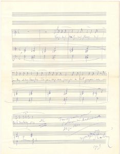 Début de sa célèbre mélodie [Offrande] sur des vers de Verlaine : « Voici des fruits, des fleurs, des feuilles et des branches / Et puis, voici mon cœur qui ne bat que pour vous »…, 7 mesures pour chant et piano, « Transcrit pour l’Album de Mademoiselle Alice Stern ». On joint une P.A.S. musicale avec les 3 premières mesures de cette mélodie notées au dos d’une carte postale (photo de Gontran Arcouët), avec dédicace à Mlle Picheling (1932) ; carte de visite (deuil).