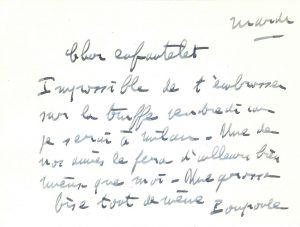 « Cher enfantelet Impossible de t’embrasser sur la truffe vendredi car je serai à Milan. Une de nos amies le fera d’ailleurs bien mieux que moi. Une grosse bise tout de même »...