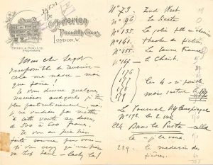 Intéressante correspondance sur ses collections d’estampes et de livres, et sur ses concerts. Pugno, souvent en tournées, charge Sagot de ses achats à Drouot, et lui parle de sa musique à travers ses différents concerts qu’il entreprend en Europe. Les lettres sont écrites de Paris, Gargenville, Saint-Jean-sur-Mer, Londres, Edinburgh, Saint Jean sur mer, Bruges, Vienne, Mayence, Scheveningue. Londres, avec liste d’estampes à acheter, sans aller au-delà de 600 francs pour l’ensemble... 12 juin 1903, sur les lots de Rops achetés à la vente publique du 30 mai… Saint-Jean-sur-Mer (Alpes-Maritimes) 15 février 1904 : « mon année sera superbe comme chaque année. Grâce au ciel – j’ai une santé de colosse et une énergie féroce pour mener à bien cette vie effroyablement fatigante. Pour vous donner une simple idée de quelques tours de force, je joue le 24 Fév. au soir à Venise le concert terminera à 11 heures, à 11 heures 20, je prendrai le rapide pour Milan, Bâle, Calais et je répéterai à Londres le matin du 27 – concert le soir – et le 29 à 3 h après-midi – concert à Nice. C’est pas mal comme crochet – hein – Venise-Londres-Nice en cinq jours – 3 concerts ». Il compte voir les « belles choses que vous m’annoncez, Raffet, Bracquemont et Rops. Ne comptez pas sur moi pour vous céder mes Fantin. Hélas non, avec ma vie de commis voyageur en musique je n’ai pas vu l’exposition de Lepère – et j’en suis triste, car vous connaissez a foi et mon adoration pour ce grand artiste […] je vous avais chargé de me retenir un A rebours. J’ai tous les livres de Lepère et je ne veux pas en manquer un »… Edinburgh 12 décembre 1904, pour la souscription du catalogue d’Auguste Lepère et un lot de Fantin-Latour. « Je rentre à Paris pour jouer le 18 aux Concerts Colonne […] je suis dans la neige jusqu’au cou, et le froid jusqu’aux os ! Quel foutu métier ! ». Schéveningue 31 août 1905 : « J’ai une série de concerts en Belgique et en Hollande. Hier au soir, j’ai joué ici ; Dimanche, je joue à Spa »… 3 septembre 1909, demandant un délai de paiement : « Vous savez que l’été est pour nous la pire des saisons et que notre moisson ne commence que vers le milieu d’octobre »… Gargenville [6 septembre 1911]. « Ne me prenez pas pour un mauvais payeur » ; il dû acheter une maison dans le Midi, a eu des embêtements de maladie... Mais « les Concertos vont sévir à Hambourg, à Berlin, Elberfeld, à Anvers, 8 fois en Angleterre et en Écosse, et le 8 novembre je reviens transfiguré en Crésus »... Vienne 24 janvier 1912, sur sa tournée : « La Haye, Arnheim, Haarlem, Amsterdam, Nancy, Vienne, Lemberg, Cracovie, Agram – et demain matin je pars pour l’Allemagne où j’ai 3 concerts – Ratisbonne, Baden-Baden et Munich […] je suis inouï d’énergie et de vaillance chaque jour des 10 et 13 heures de chemin de fer – et quelquefois concert le même jour — et jamais ne ne me suis senti plus fort »… Bruges 19 décembre 1912 : « Le catalogue est rudement alléchant et je voudrais bien pousser quelques numéros ! Mais !!! Comment payer ? […] je suis dégoûté de la vie... et j’ai très mal au ventre – ce qui est douloureux. Je joue ce soir avec... deux verres d’eau de riz dans la besace »… [17 mai 1913], au sujet des lots qu’il a pu, grâce à Sagot, insérer dans une vente de Delteil (Lepère, Fantin, Forain, Lautrec, Daumier) ; il demande une avance sur la vente… Etc. On joint : un relevé de comptes de la Librairie Sagot, et 2 cartes postales.