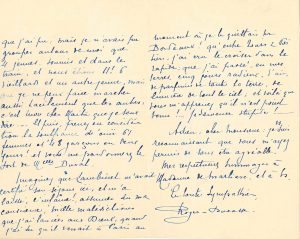Samedi [12.X.1910], remerciant Mme de Marliave [Marguerite Long] pour « l’issu de ces négociations. Entendu donc pour le jeudi de Décembre. Mais je voudrai avant m’entendre avec elle sur différents points. Lambinet se lamente de votre silence prolongé »... [Le Taillan 11.VIII.1911]. « Ici, tout va bien. Je prépare le miel pour mon hiver. Aucune nouvelle de Fauré. Où est-il ? »... [21.VI.1913]. Projet de déjeuner avec André Lambinet : « Vous pourriez jouer avec lui Pénélope de 2 h de l’après-midi à 2 heures du matin. La campagne est magnifique »... Jeudi soir. « Tous nos vœux sont remplis ! Mlle Lefébure-Wély a remporté la première médaille : je ne suis qu’une unité dans ce succès ; où je me multiplie, c’est dans sa nomination à la tête de tout le troupeau »... Jeudi. « Je suis affolé car il faut que toute ma partition soit à Pétersbourg le 10 septembre ! Et j’ai juste commencé en arrivant ici mon dernier acte. Alors je ne bouge pas, je ne vois personne et je n’écris pas »… Il s’inquiète de la santé de Marguerite Long : « Quand je pense qu’elle va passer deux mois, sans mettre ses mains sur le piano, je trouve ça ahurissant ! »...